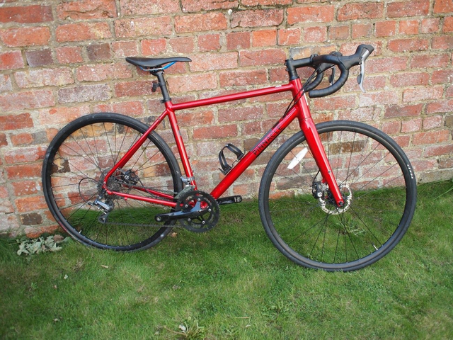 700c wheels, carbon forks, 2 x 8 Shimano Claris drivetrain, cable disk brakes