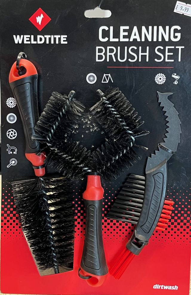 -Includes, Frame and tyre wrap around brush, sprocket brush for cleaning chain/gear systems and a tapered brush for brakes, spokes etc,